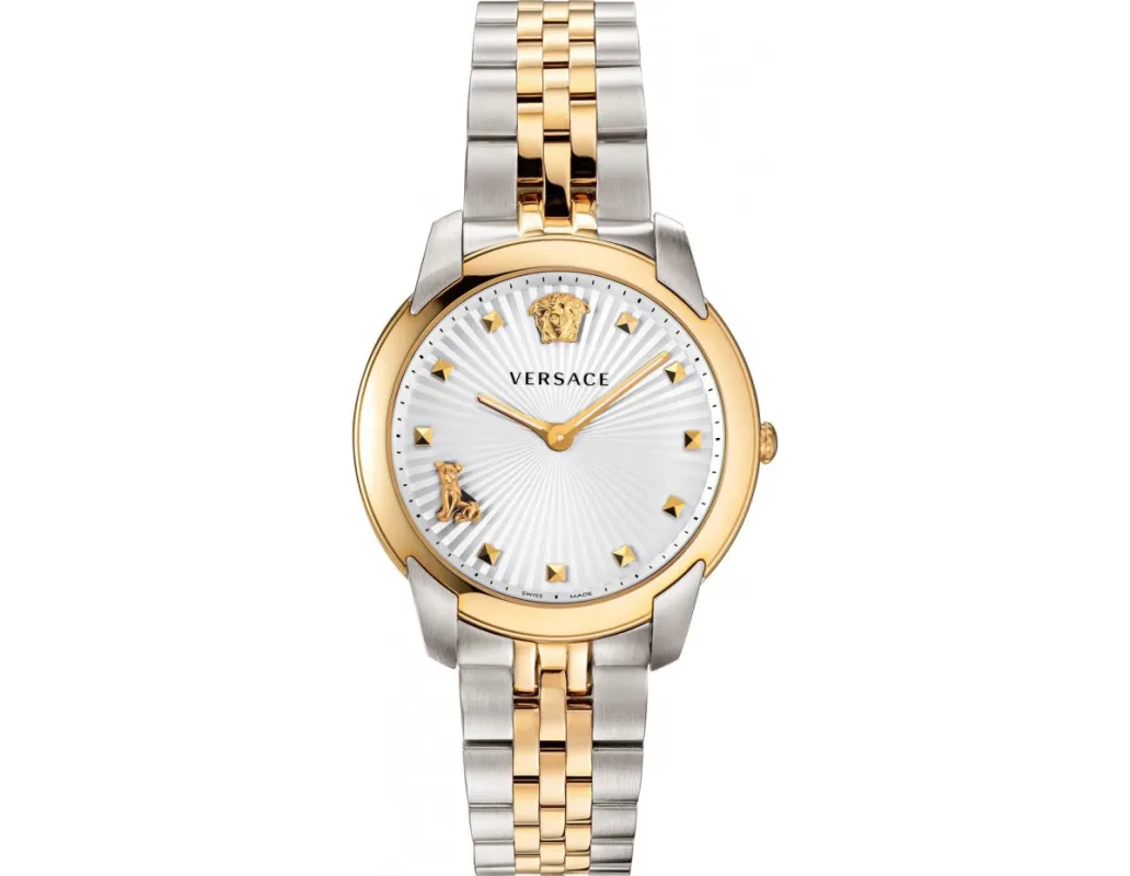 Фірмовий циферблат із символом Medusa та рельєфною текстурою одразу підкреслює приналежність до бренду Versace.